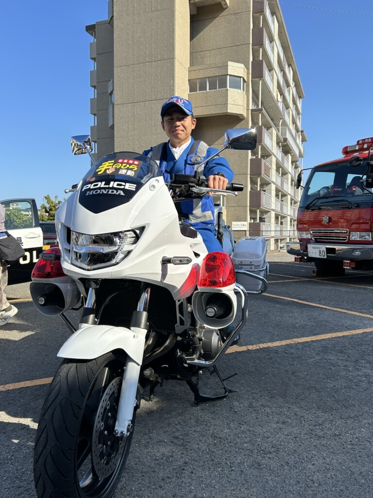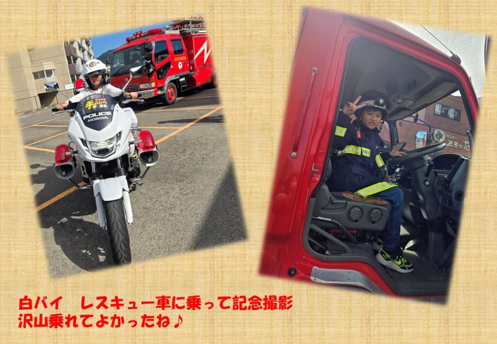 白バイ隊員の方が子ども達をシートに乗せてくれたり赤色灯を点灯したり♪とても喜んでいました!