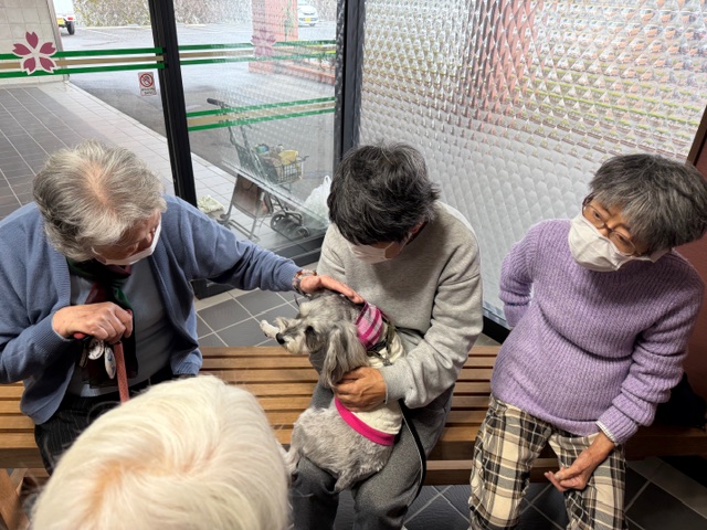 女性たちもお茶を飲みながらなでなで♪ いつもより笑顔が増し増しですね!